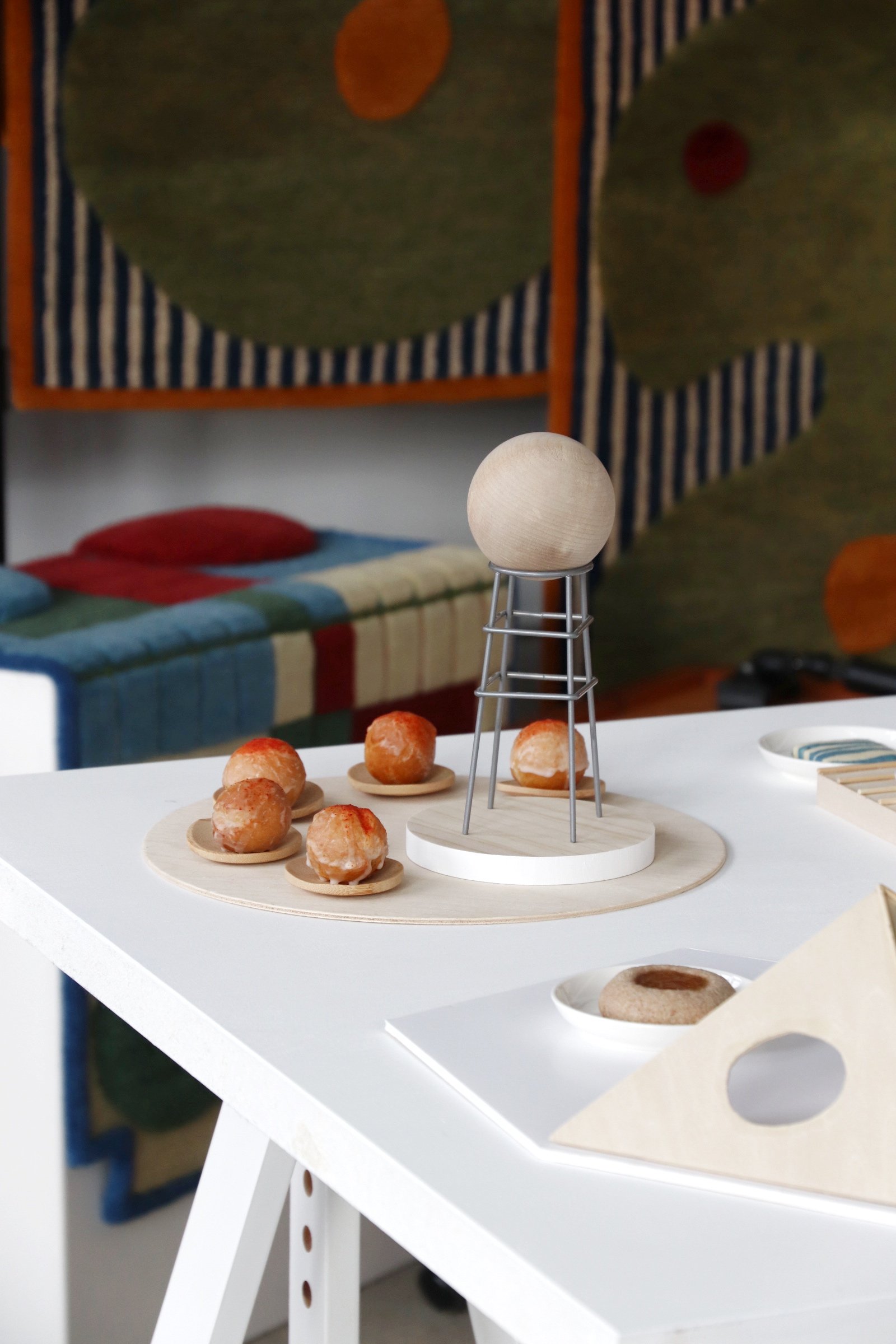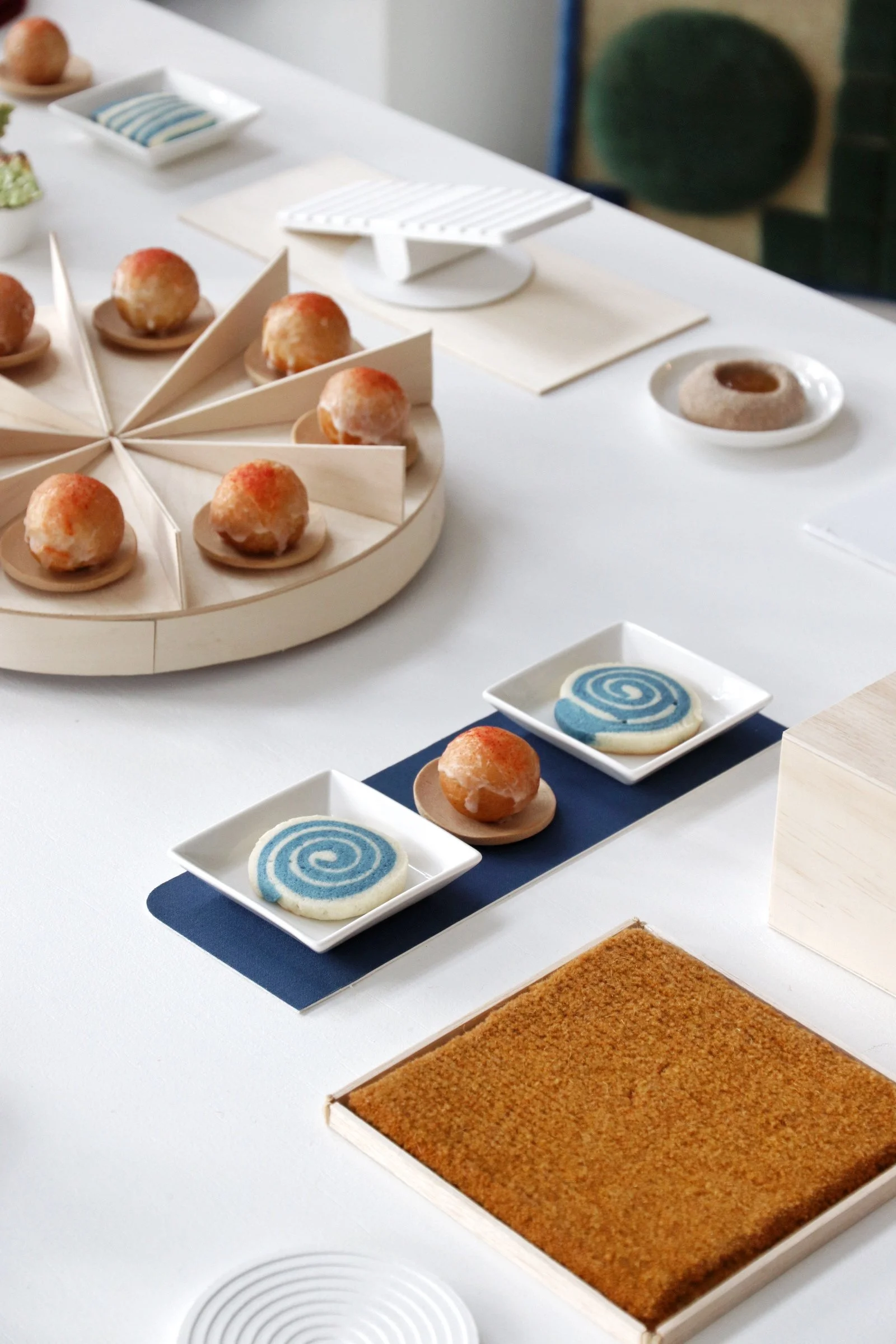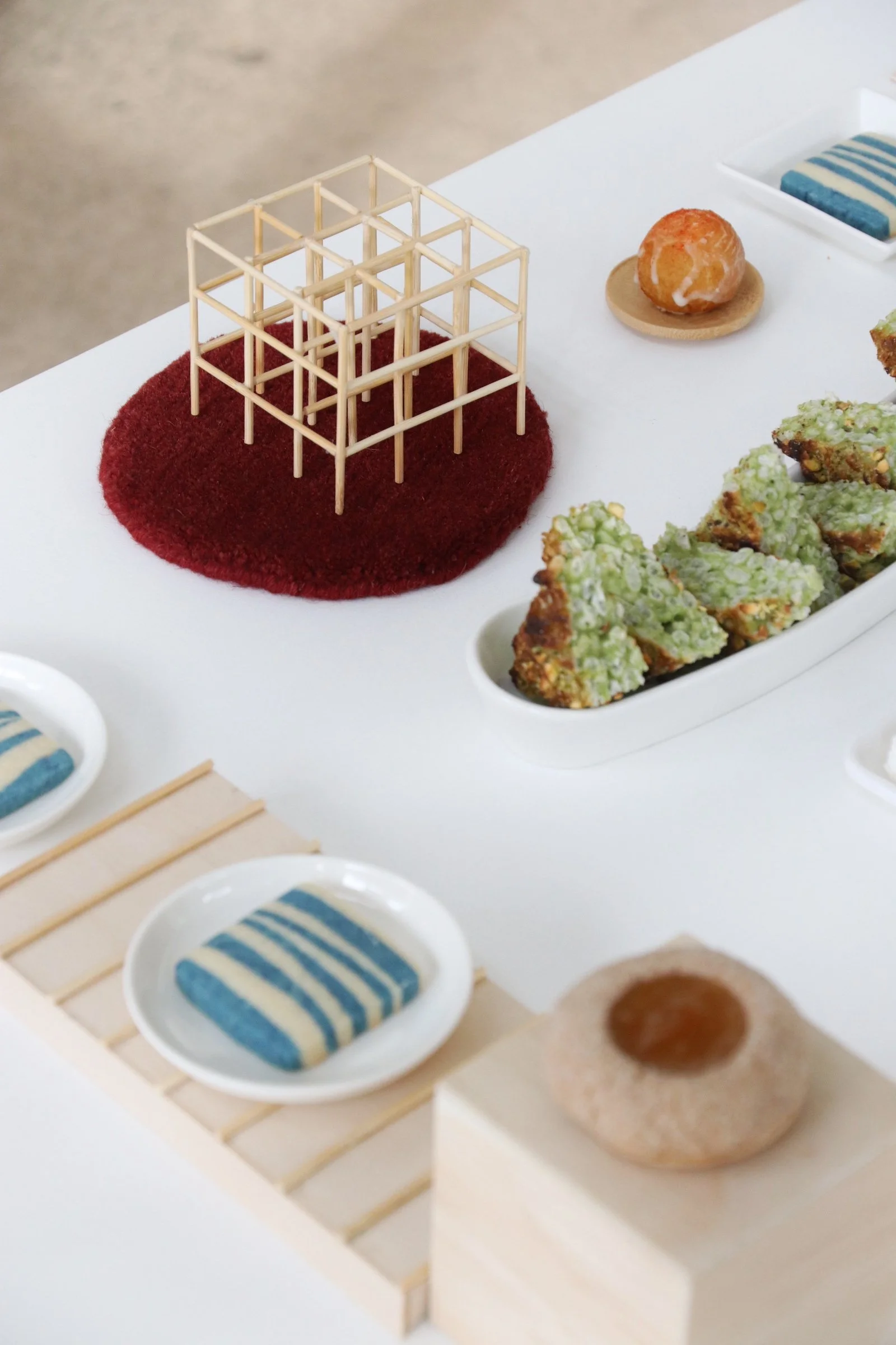 Collaborating with Studio Tenjung, I contributed to the launch of Scapes, a collection of botanically dyed rugs presented at In The Comfort Of, in Seattle. For this event, I created a selection of sweets inspired by flavors of Nepal and Tibetan culture/tradition. I designed and built the tablescape to reflect the playful and interwoven process behind the collection. Softly inspired by referencing playscapes designed by Isamu Noguchi. The installation demonstrated how food can interpret, complement and amplify a creative vision. This collaboration highlighted the synergy between culinary design, art and culture.